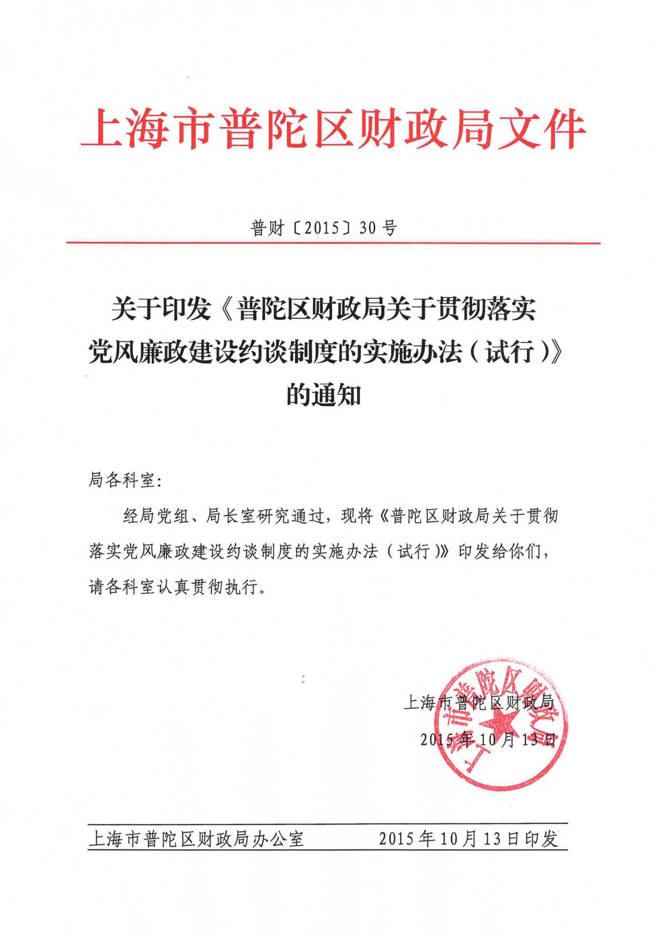 经局党组、局长室研究通过,现将《普陀区财政局关于贯彻落实党风廉政建设约谈制度的实施办法(试行)》印发给你们,请各科室认真贯彻执行。
