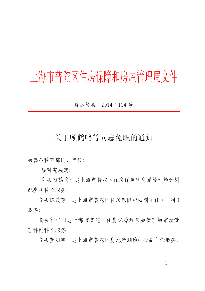 免去顾鹤鸣同志上海市普陀区住房保障和房屋管理局计划配套科科长职务;