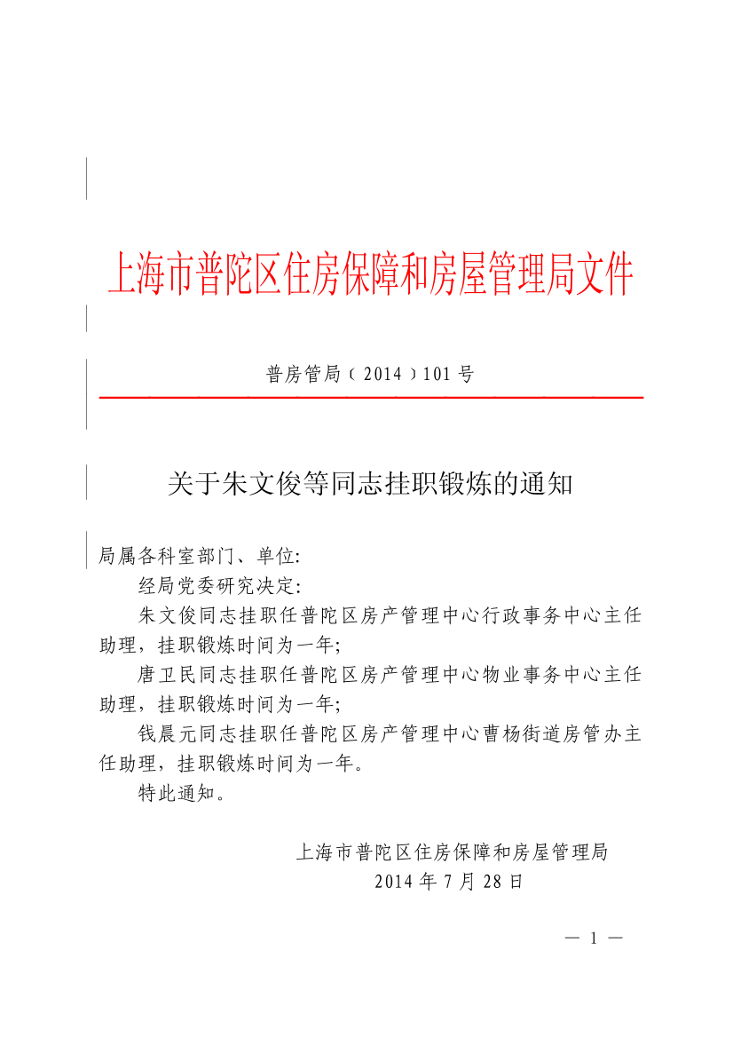 朱文俊同志挂职任普陀区房产管理中心行政事务中心主任助理,挂职锻炼时间为一年;