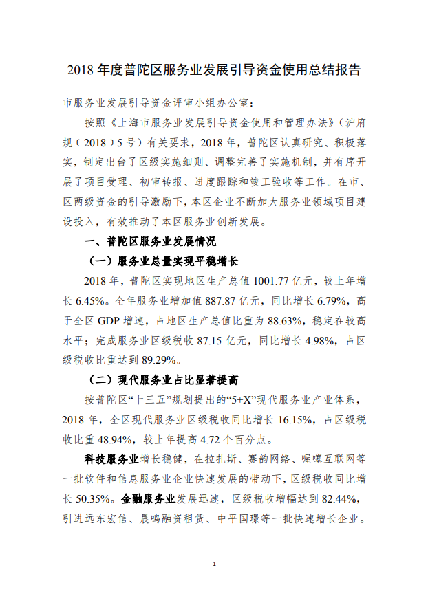 2018年度普陀区服务业发展引导资金使用总结报告