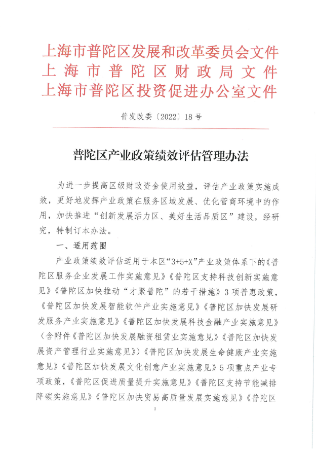 产业政策绩效评估适用于本区“3+5+X”产业政策体系下的《普陀区服务企业发展工作实施意见》《普陀区支持科技创新实施意见》《普陀区加快推动“才聚普陀”的若干措施》3项普惠政策,《普陀区加快发展智能软件产业实施意见》《普陀区加快发展研发服务产业实施意见》《普陀区加快发展科技金融产业实施意见》(含附件《普陀区加快发展融资租赁业实施意见》《普陀区加快发展资产管理行业实施意见》)《普陀区加快发展生命健康产业实施意见》《普陀区加快发展文化创意产业实施意见》5项重点产业专项政策,《普陀区促进质量提升实施意见》《普陀区支持节能减排降碳实施意见》《普陀区加快贸易高质量发展实施意见》《普陀区支持商业创新发展的实施意见》《普陀区加快发展法律服务业实施意见》及后续出台的特色专项政策。