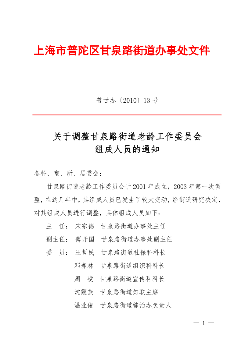 关于调整甘泉路街道老龄工作委员会组成人员的通知