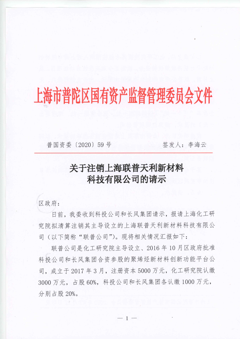 日前,我委收到科投公司和长风集团请示,报请上海化工研究院拟清算注销其主导设立的上海联普天利新材料科技有限公司(以下简称“联普公司”)。现将相关情况汇报如下: