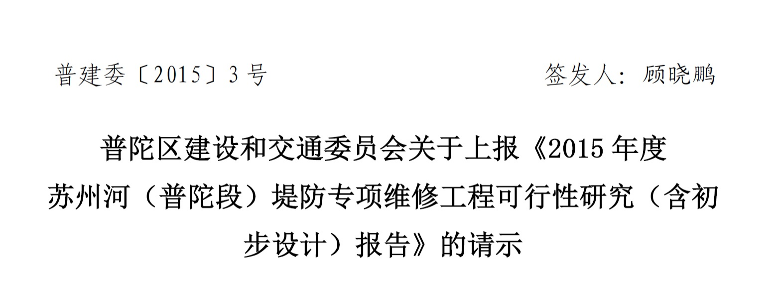 现将《2015年度苏州河(普陀段)堤防专项维修工程可行性研究(含初步设计)报告》随文上报,请予审批。