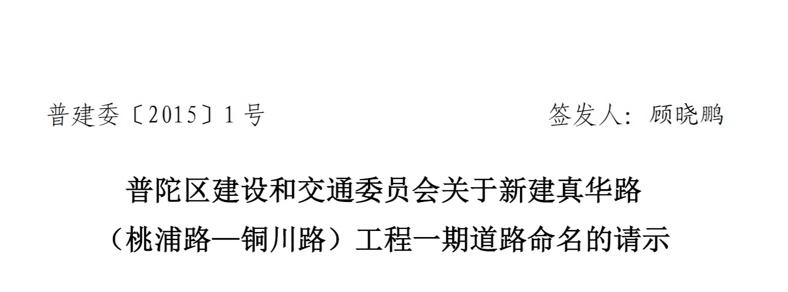 普陀区建设和交通委员会关于新建真华路(桃浦路—铜川路)工程一期道路命名的请示