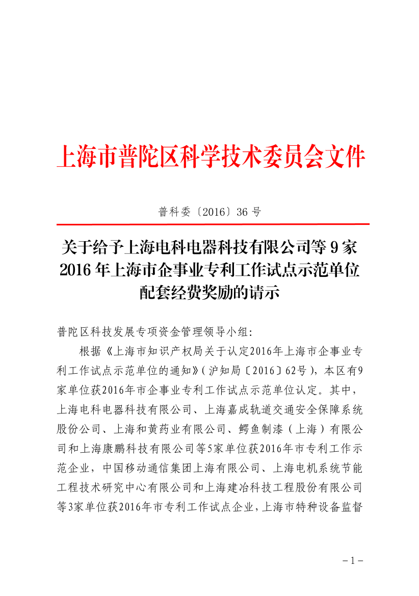 关于给予上海电科电器科技有限公司等9家2016年上海市企事业专利工作试点示范单位配套经费奖励的请示
