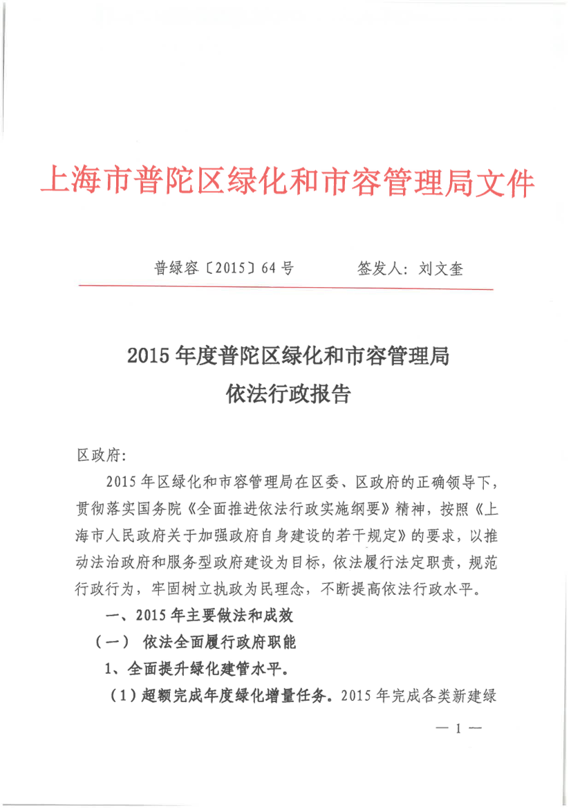 2015年度普陀区绿化和市容管理局依法行政报告