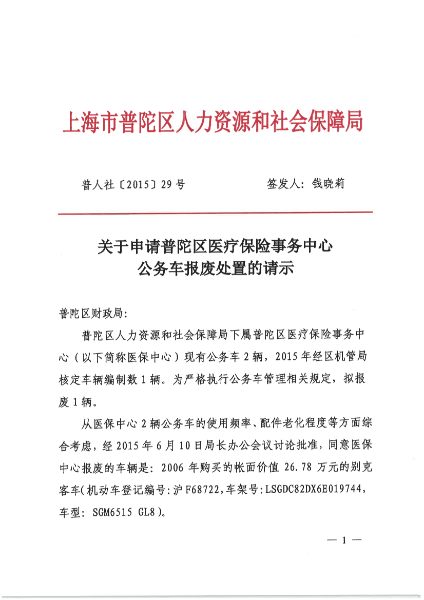 关于申请普陀区医疗保险事务中心公务车报废处置的请示