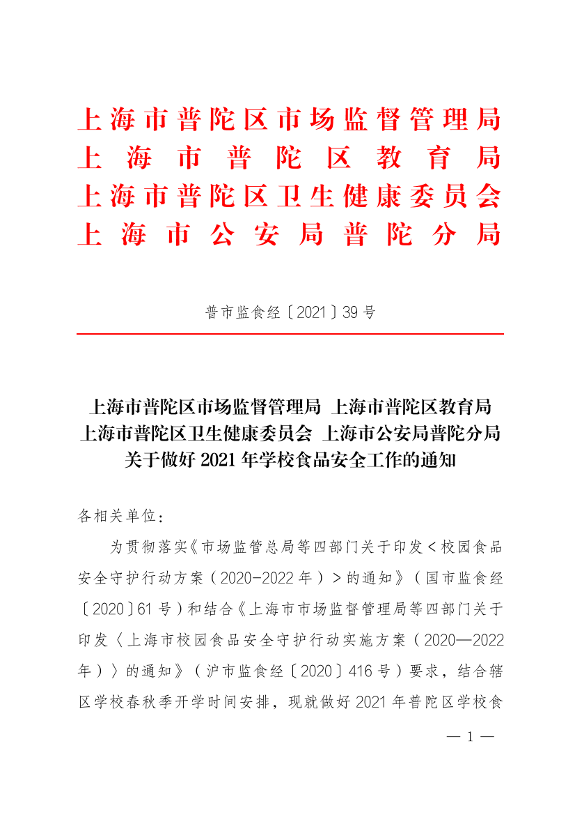 为贯彻落实《市场监管总局等四部门关于印发<校园食品安全守护行动方案(2020-2022年)>的通知》(国市监食经〔2020〕61号)和结合《上海市市场监督管理局等四部门关于印发〈上海市校园食品安全守护行动实施方案(2020—2022年)〉的通知》(沪市监食经〔2020〕416号)要求,结合辖区学校春秋季开学时间安排,现就做好2021年普陀区学校食品安全工作通知如下: