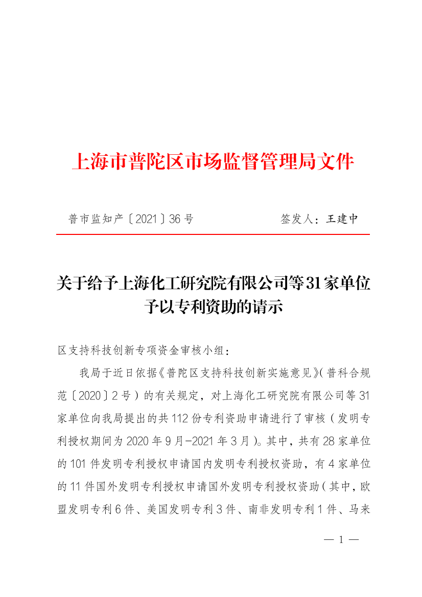 关于给予上海化工研究院有限公司等31家单位予以专利资助的请示