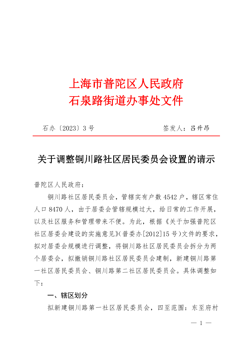 拟新建铜川路第一社区居民委员会,四至范围:东至府村路,南至铜川路,西至大场浦河,北至礼泉路,管辖牡丹新苑、岚皋馨苑、府村苑3个小区,共有居民1594户,常住人口3920人。