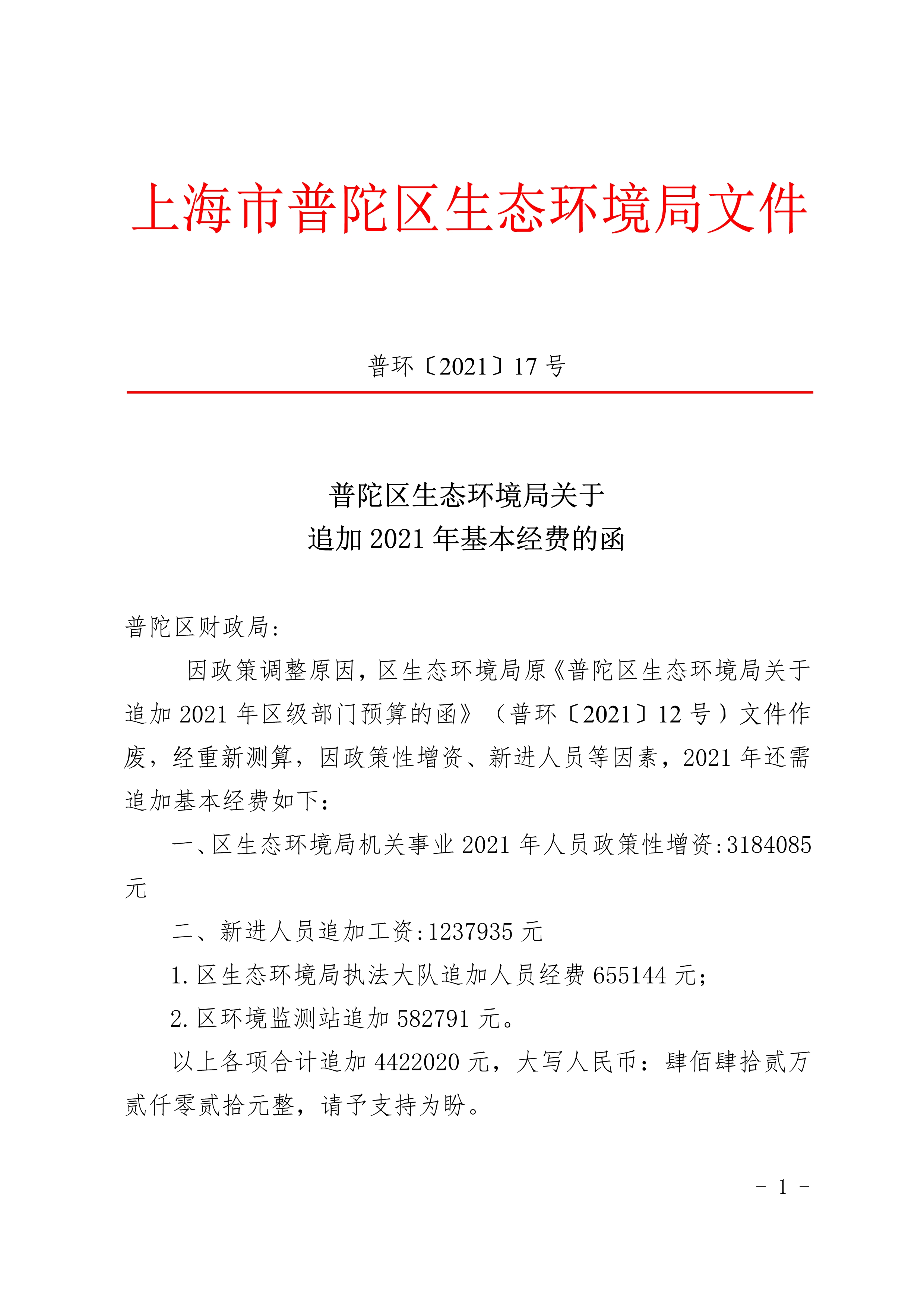 因政策调整原因,区生态环境局原《普陀区生态环境局关于追加2021年区级部门预算的函》(普环〔2021〕12号)文件作废,经重新测算,因政策性增资、新进人员等因素,2021年还需追加基本经费如下: