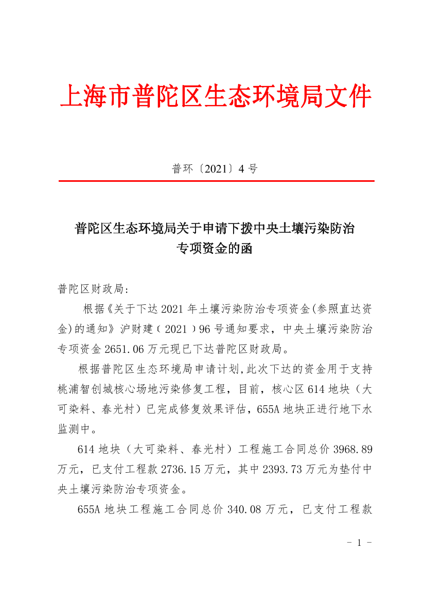 普陀区生态环境局关于申请下拨中央土壤污染防治专项资金的函