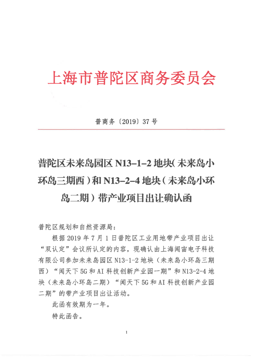 根据2019年7月1日普陀区工业用地带产业项目出让“双认定”会议所认定的内容,现确认由上海闻宙电子科技有限公司参加未来岛园区N13-1-2地块(未来岛小环岛三期西)“闻天下5G和AI科技创新产业园一期”和N13-2-4地块(未来岛小环岛二期)“闻天下5G和AI科技创新产业园二期”的带产业项目出让活动。