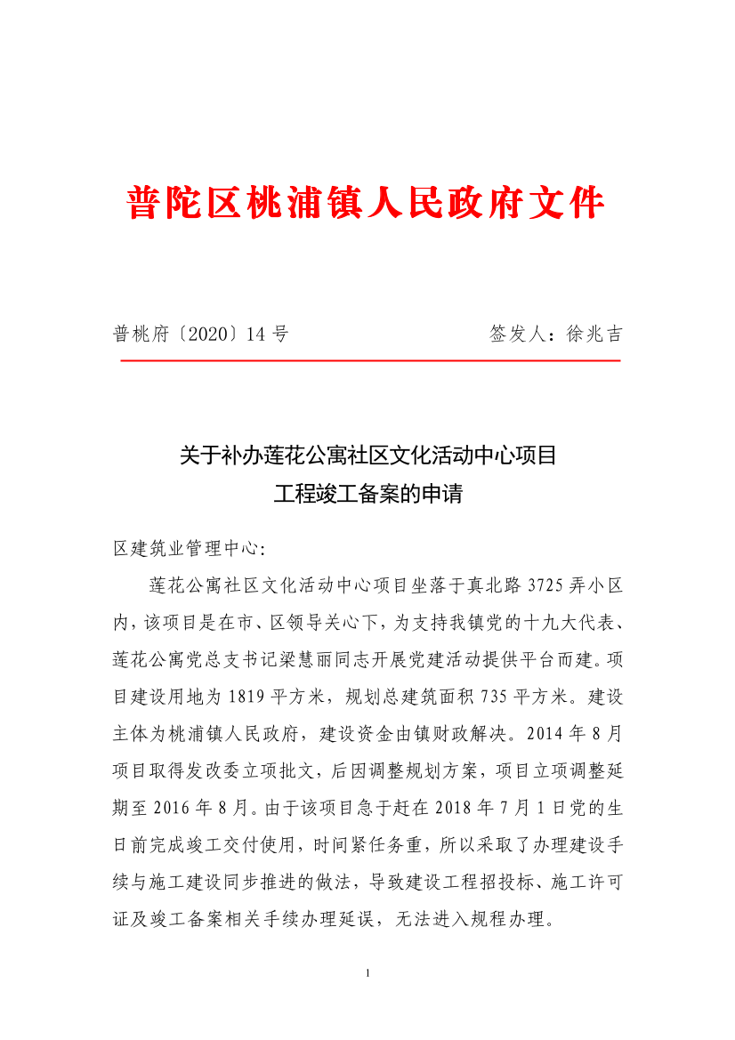 莲花公寓社区文化活动中心项目坐落于真北路3725弄小区内,该项目是在市、区领导关心下,为支持我镇党的十九大代表、莲花公寓党总支书记梁慧丽同志开展党建活动提供平台而建。项目建设用地为1819平方米,规划总建筑面积735平方米。建设主体为桃浦镇人民政府,建设资金由镇财政解决。2014年8月项目取得发改委立项批文,后因调整规划方案,项目立项调整延期至2016年8月。由于该项目急于赶在2018年7月1日党的生日前完成竣工交付使用,时间紧任务重,所以采取了办理建设手续与施工建设同步推进的做法,导致建设工程招投标、施工许可证及竣工备案相关手续办理延误,无法进入规程办理。目前项目涉及规划、用地等相关证照全部齐全,土建工程全部结束,唯缺工程竣工备案手续没有完成,今特向贵中心提出申请,请予同意我镇按相关规程补办莲花公寓社区文化活动中心项目竣工备案的相关手续。