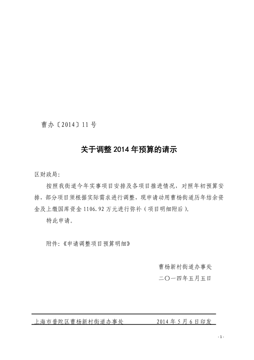 按照我街道今年实事项目安排及各项目推进情况,对照年初预算安排,部分项目须根据实际需求进行调整,现申请动用曹杨街道历年结余资金及上缴国库资金1106.92万元进行弥补(项目明细附后)。
