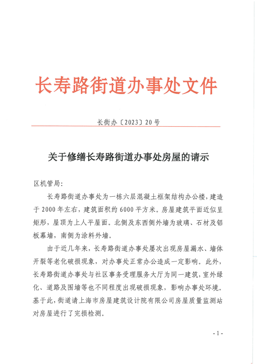 由于近几年来,长寿路街道办事处屡次出现房屋漏水、墙体开裂等老化破损现象,对办事处正常办公造成一定影响。此外,长寿路街道办事处与社区事务受理服务大厅为同一建筑,室外绿化、道路及围墙等也不同程度出现破损现象,影响办事处环境。基于此,街道请上海市房屋建筑设计院有限公司房屋质量监测站对房屋进行了完损检测。