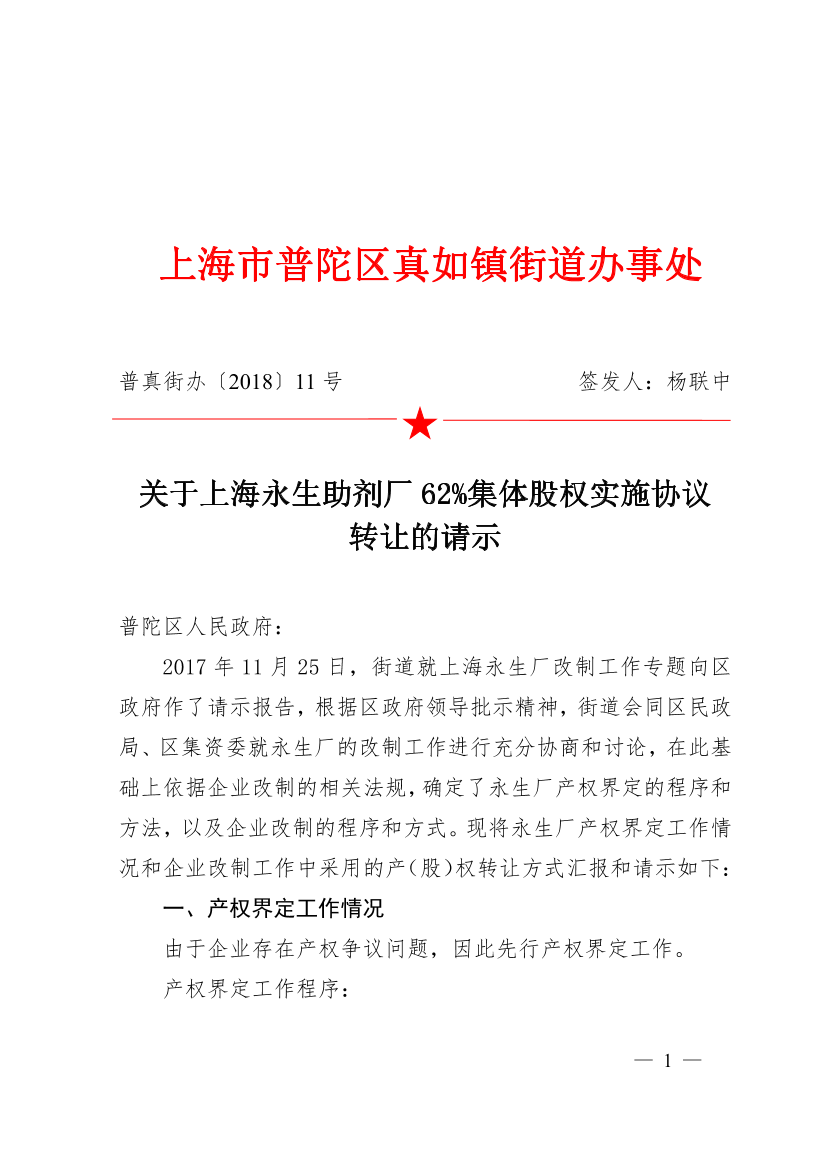 2017年11月25日,街道就上海永生厂改制工作专题向区政府作了请示报告,根据区政府领导批示精神,街道会同区民政局、区集资委就永生厂的改制工作进行充分协商和讨论,在此基础上依据企业改制的相关法规,确定了永生厂产权界定的程序和方法,以及企业改制的程序和方式。现将永生厂产权界定工作情况和企业改制工作中采用的产(股)权转让方式汇报和请示如下: