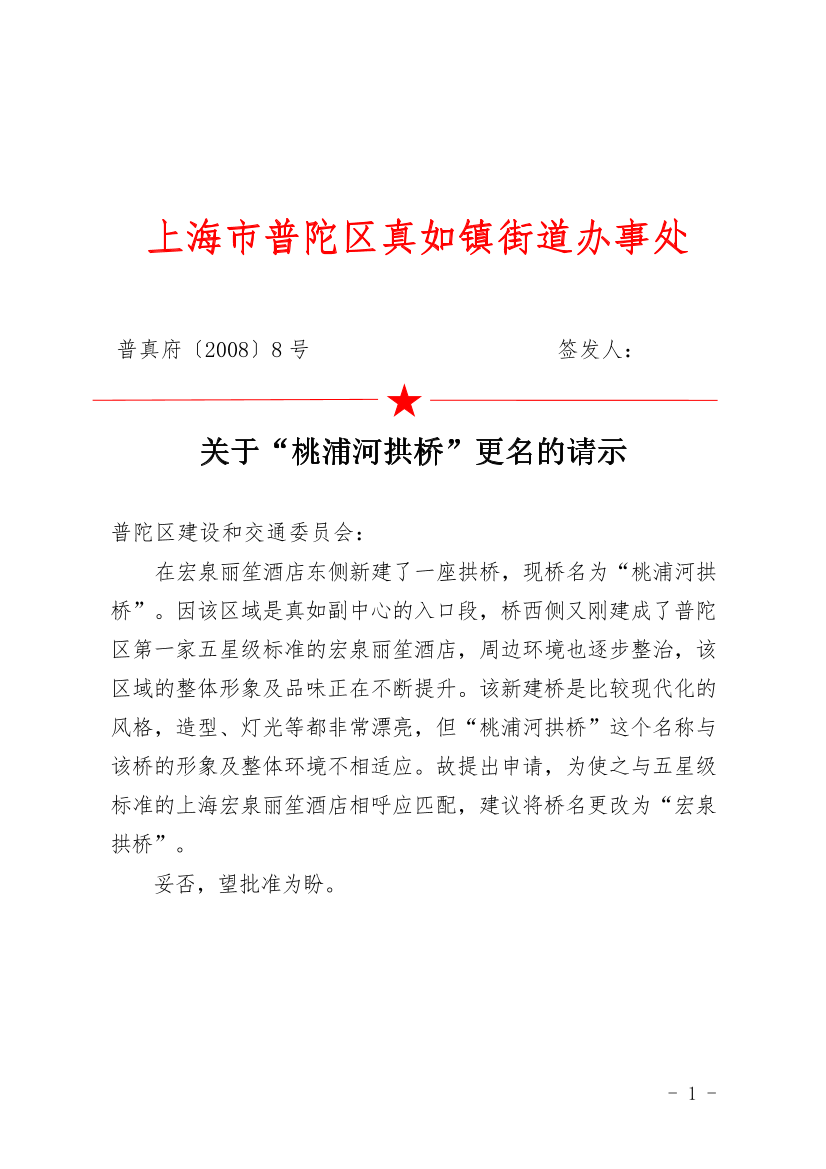 在宏泉丽笙酒店东侧新建了一座拱桥,现桥名为“桃浦河拱桥”。因该区域是真如副中心的入口段,桥西侧又刚建成了普陀区第一家五星级标准的宏泉丽笙酒店,周边环境也逐步整治,该区域的整体形象及品味正在不断提升。该新建桥是比较现代化的风格,造型、灯光等都非常漂亮,但“桃浦河拱桥”这个名称与该桥的形象及整体环境不相适应。故提出申请,为使之与五星级标准的上海宏泉丽笙酒店相呼应匹配,建议将桥名更改为“宏泉拱桥”。