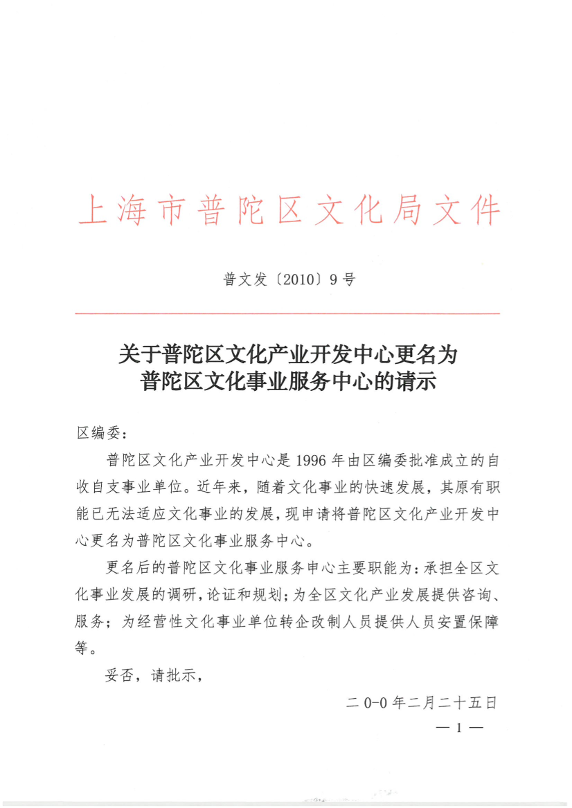 普陀区文化产业开发中心是1996年由区编委批准成立的自收自支事业单位。近年来,随着文化事业的快速发展,其原有职能已无法适应文化事业的发展,现申请将普陀区文化产业开发中心更名为普陀区文化事业服务中心。
