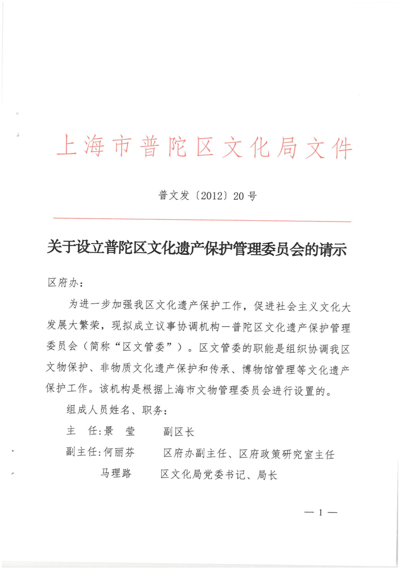 为进一步加强我区文化遗产保护工作,促进社会主义文化大发展大繁荣,现拟成立议事协调机构——普陀区文化遗产保护管理委员会(简称“区文管委”)。区文管委的职能是组织协调我区文物保护、非物质文化遗产保护和传承、博物馆管理等文化遗产保护工作。该机构是根据上海市文物管理委员会进行设置的。