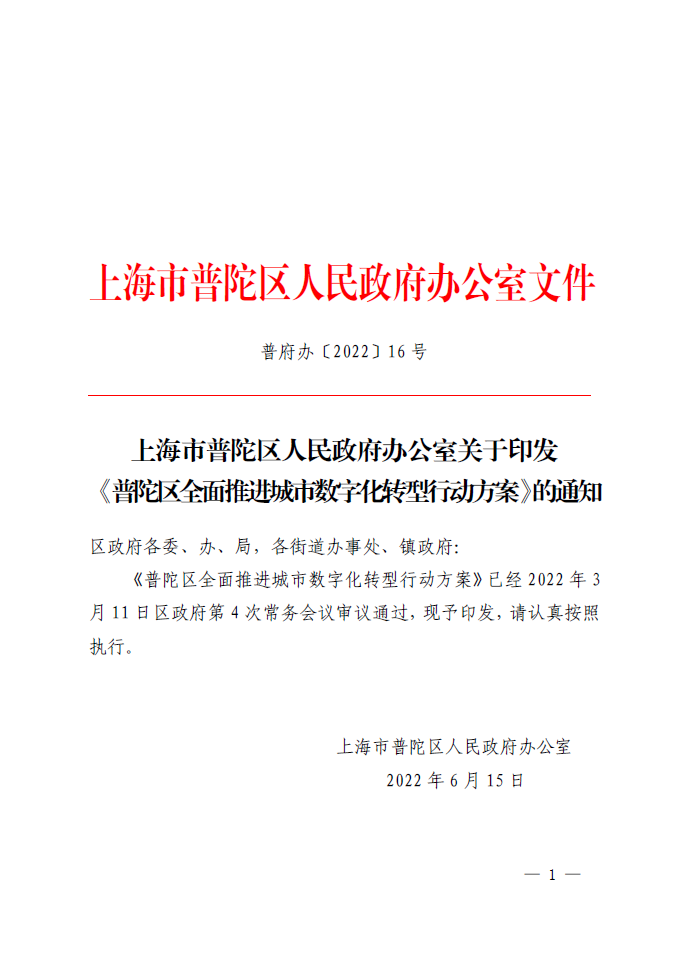 上海市普陀区人民政府办公室关于印发《普陀区全面推进城市数字化转型行动方案》的通知
