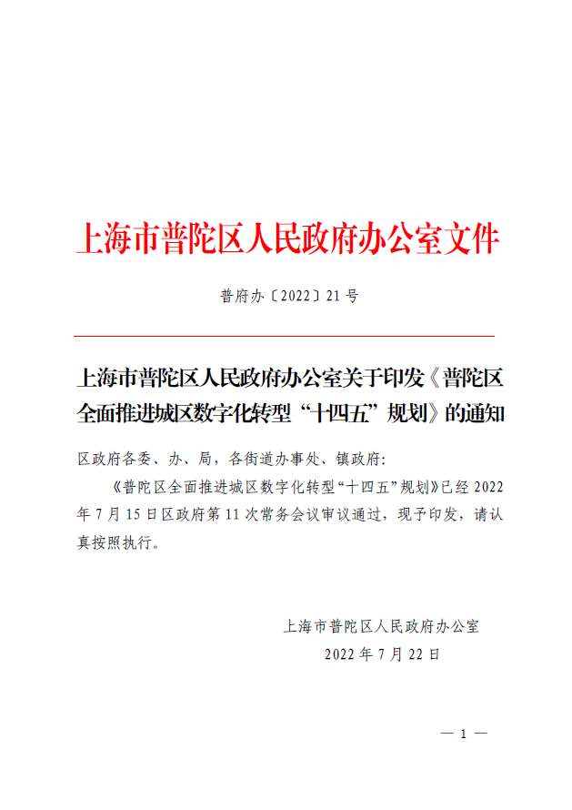 上海市普陀区人民政府办公室关于印发《普陀区全面推进城区数字化转型“十四五”规划》的通知
