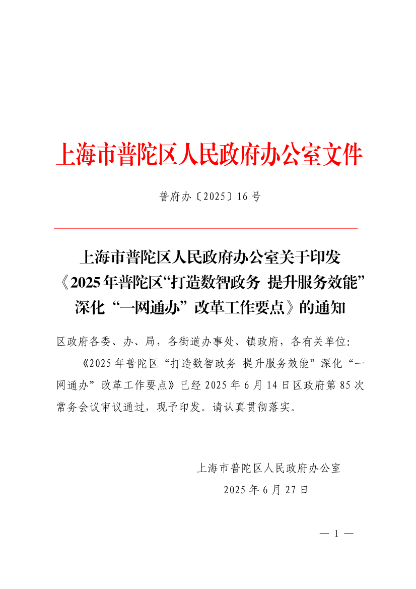 上海市普陀区人民政府办公室关于印发《2025年普陀区“打造数智政务 提升服务效能”深化“一网通办”改革工作要点》的通知
