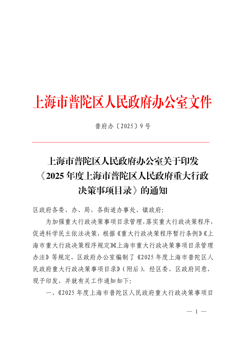 上海市普陀区人民政府办公室关于印发《2025年度上海市普陀区人民政府重大行政决策事项目录》的通知