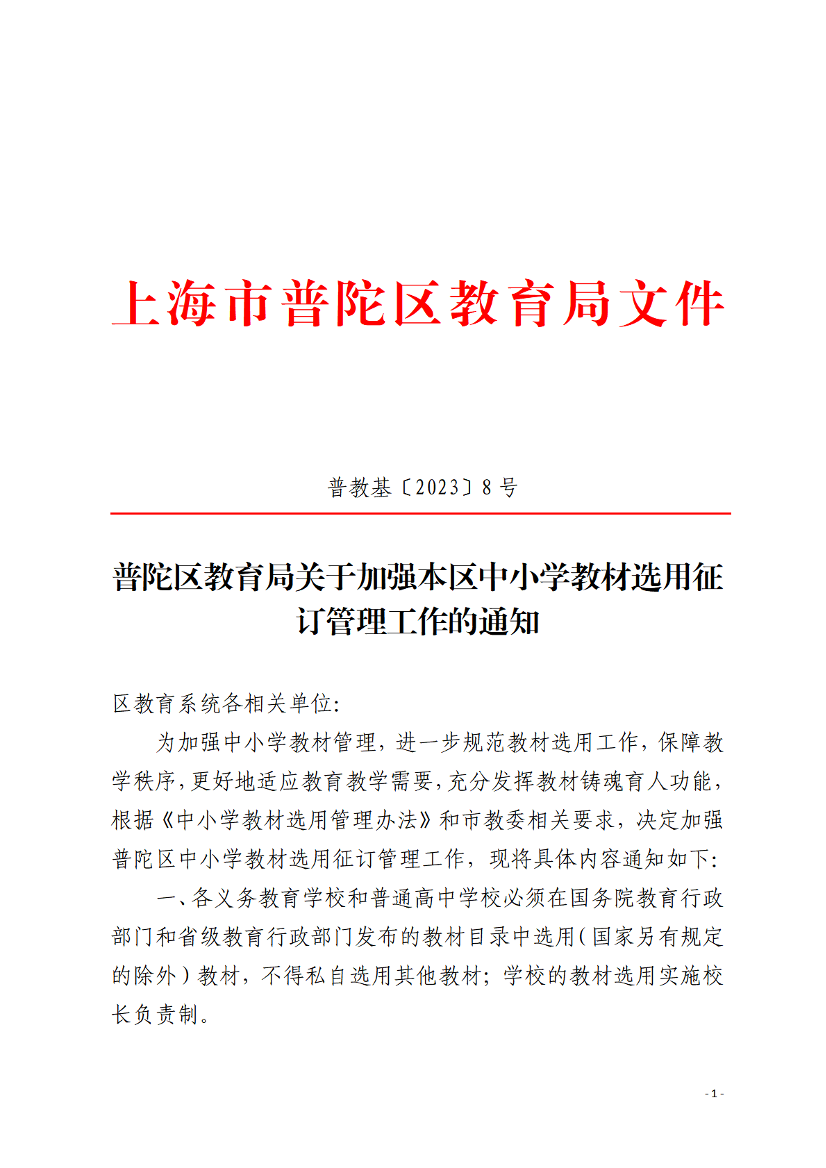 为加强中小学教材管理,进一步规范教材选用工作,保障教学秩序,更好地适应教育教学需要,充分发挥教材铸魂育人功能,根据《中小学教材选用管理办法》和市教委相关要求,决定加强普陀区中小学教材选用征订管理工作,现将具体内容通知如下: