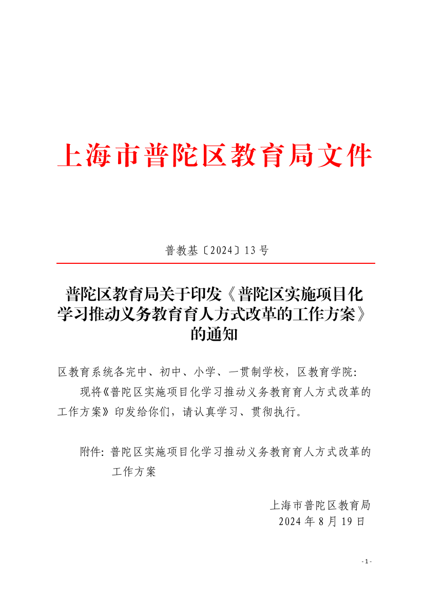 关于印发《普陀区实施项目化学习推动义务教育育人方式改革的工作方案》的通知