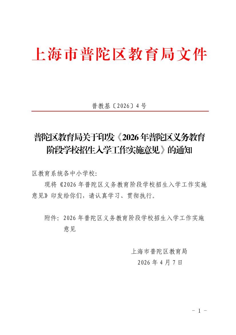 关于印发《2026年普陀区义务教育阶段学校招生入学工作实施意见》的通知