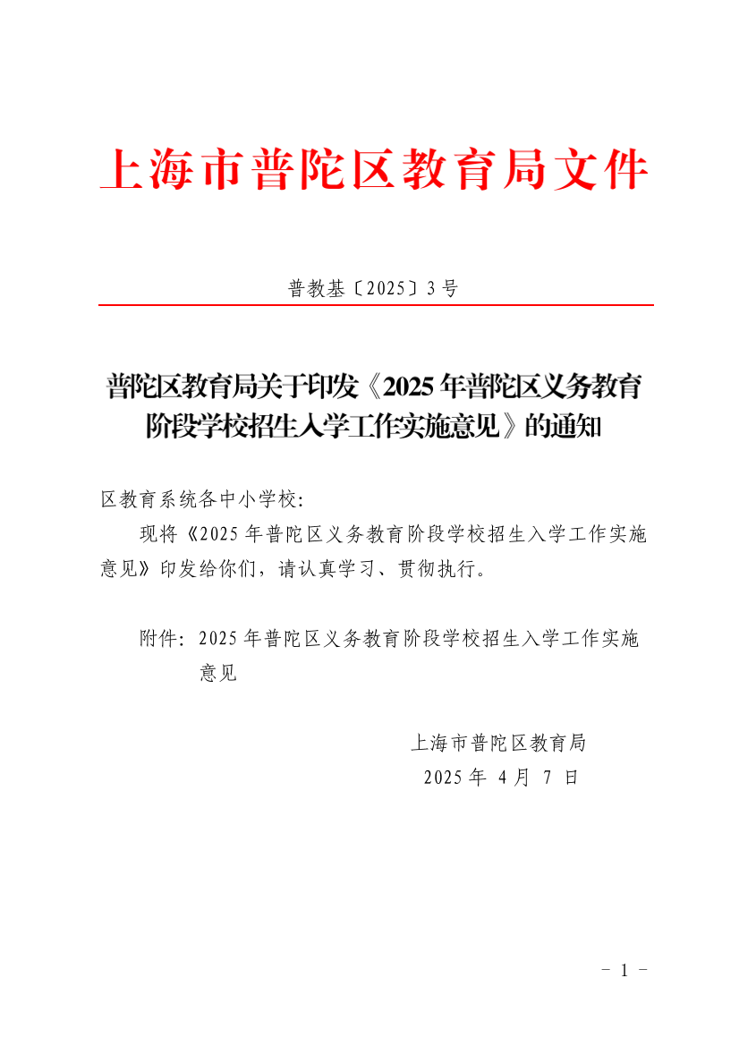 关于印发《2025年普陀区义务教育阶段学校招生入学工作实施意见》的通知