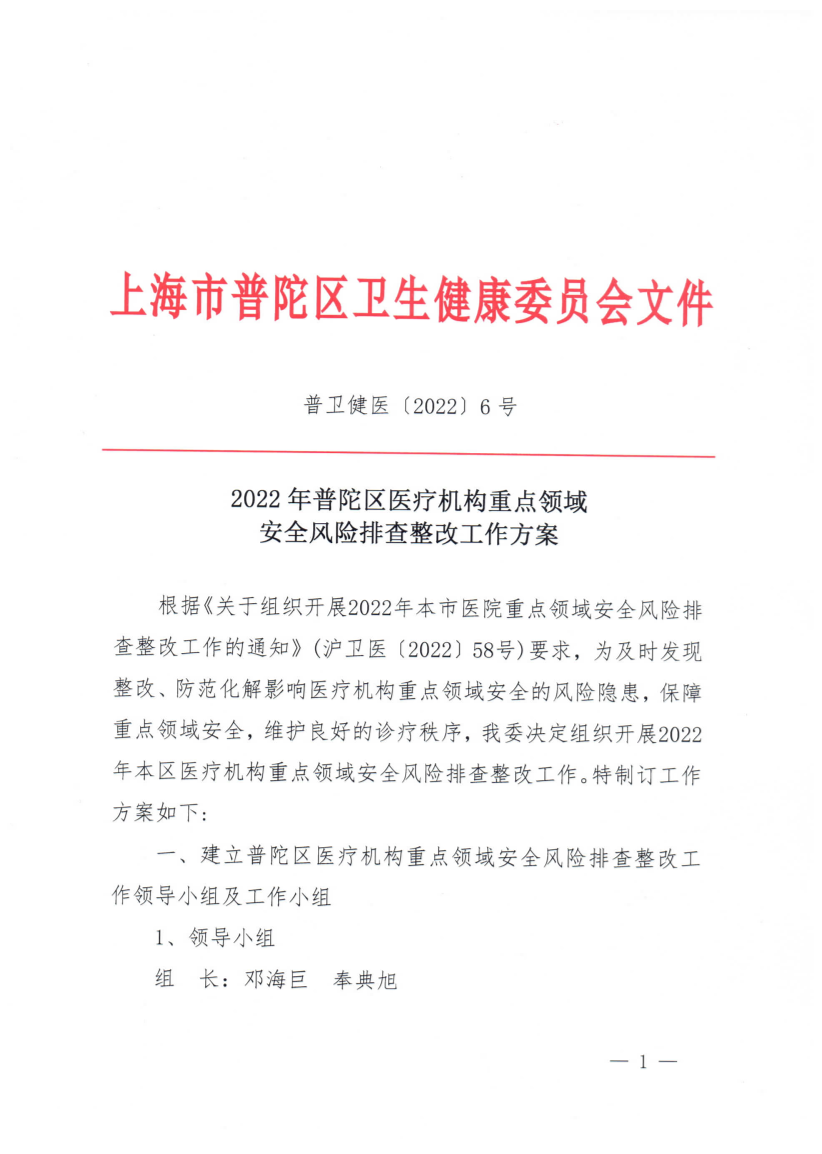 一、建立普陀区医疗机构重点领域安全风险排查整改工作领导小组及工作小组