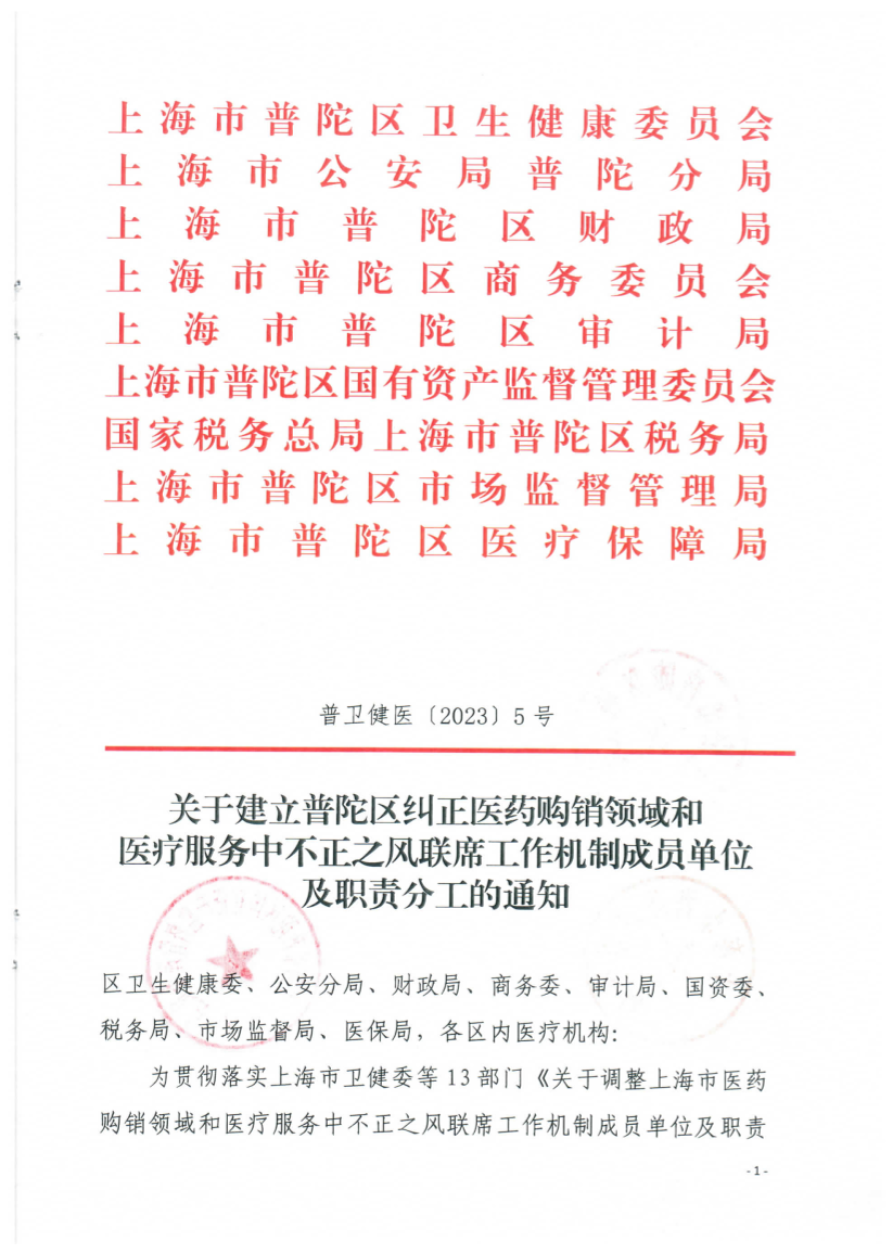 为贯彻落实上海市卫健委等13部门《关于调整上海市医药购销领域和医疗服务中不正之风联席工作机制成员单位及职责分工的通知》(沪卫医〔2023〕55号)的要求,普陀区建立了纠正医药购销领域和医疗服务中不正之风联席工作机制。现将名单及职责分工印发给你们,请遵照本通知,加强沟通和配合,认真落实上级部门布置的各项任务,协同做好纠正医药购销领域和医疗服务中不正之风有关工作。