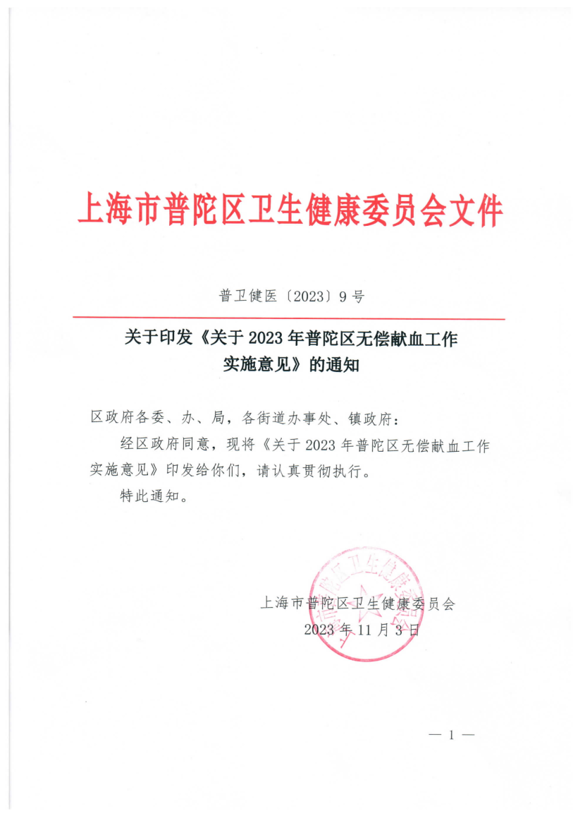 关于印发《关于2023年普陀区无偿献血工作实施意见》的通知