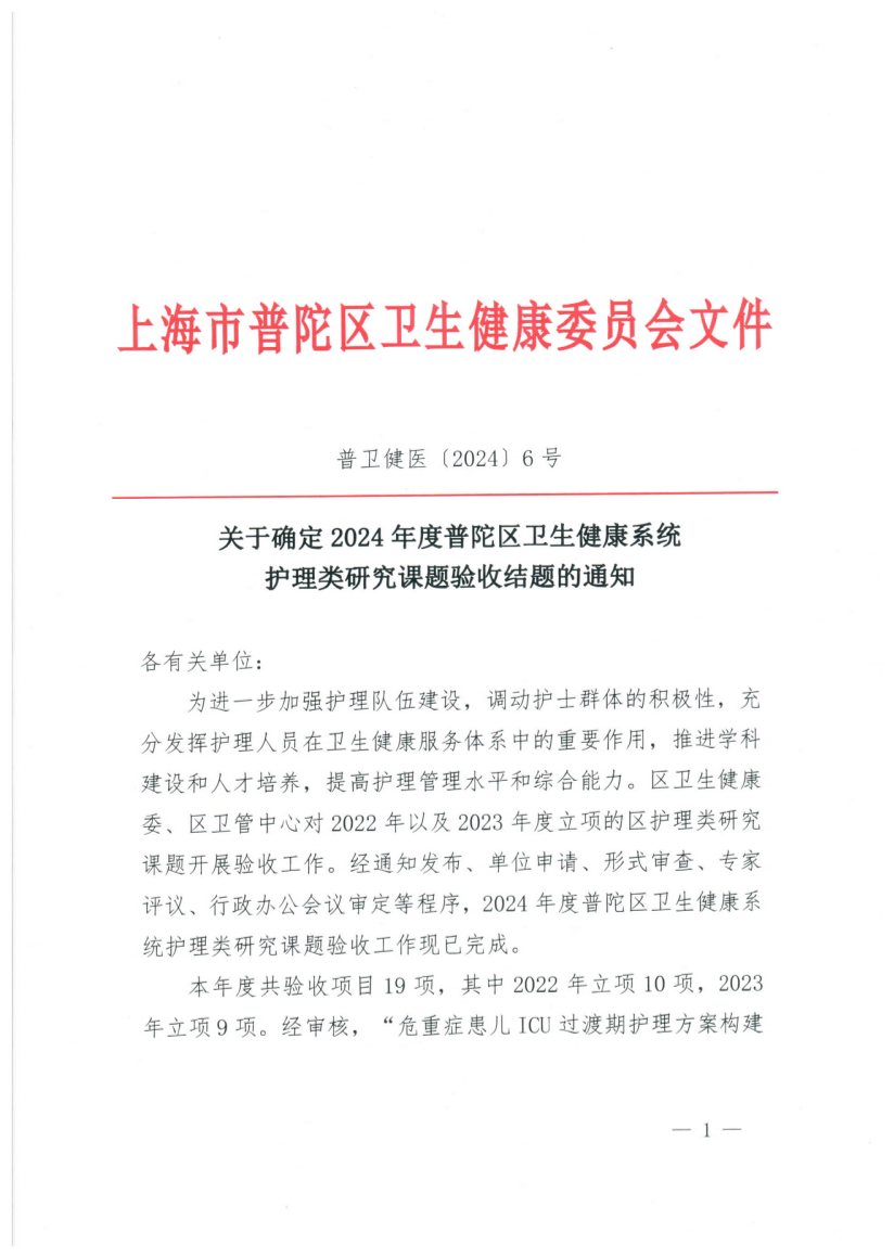 关于确定2024年度普陀区卫生健康系统护理类研究课题验收结题的通知