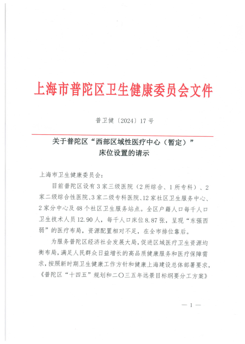 为了使建设工作顺利推进,现向上海市卫生健康委员会申请普陀区“西部区域性医疗中心(暂定)”核定床位数1000张。