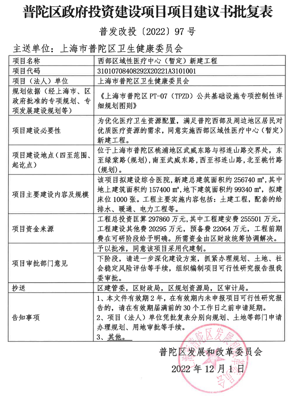 为服务普陀区经济社会发展大局,促进区域医疗卫生资源均衡布局,满足人民群众日益增长的高品质健康服务和医疗保障需求,按照新时期卫生健康工作方针和健康上海建设总体部署要求,《普陀区“十四五”规划和二〇三五年远景目标纲要分工方案》(普委办发〔2021〕15号),明确“优化桃浦、真如、万里医疗资源布局,新建西部区域性医疗中心”。2022年12月普陀区卫生健康委员会取得该项目建议书批复(普发改投〔2022〕97号)(见附件),2024年3月1日普陀区区委书记专题会第83次会议明确该项目建设方案。