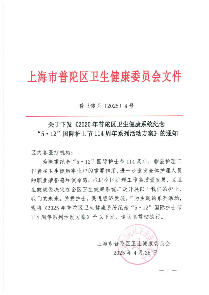 关于下发《2025年普陀区卫生健康系统纪念 “5·12”国际护士节114周年系列活动方案》的通知