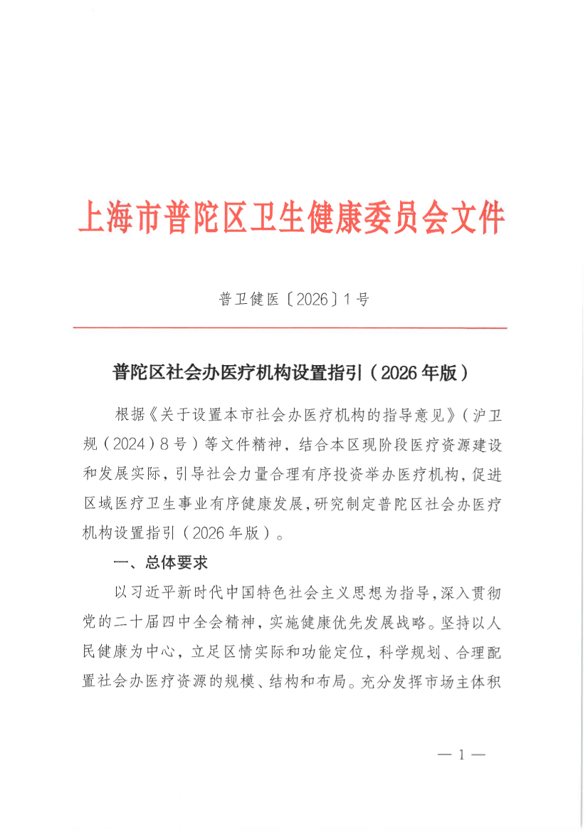 根据《关于设置本市社会办医疗机构的指导意见》(沪卫规(2024)8号)等文件精神,结合本区现阶段医疗资源建设和发展实际,引导社会力量合理有序投资举办医疗机构,促进区域医疗卫生事业有序健康发展,研究制定普陀区社会办医疗机构设置指引(2026年版)。