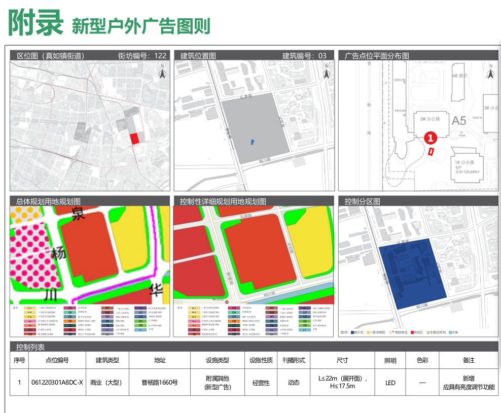 根据《上海市户外广告设施设置规划(2023-2027年)》第五条第四款:“支持设置与城市空间环境相适应的创新型户外广告设施(指以吸引受众提高传播效能为目的,以前所未见的新媒介形式或打破常规传统方式设置的户外广告设施),可以不受常规性户外广告设施设置要求的限制进行试验性尝试,设置方案需经市绿化市容局组织技术论证同意后,方可纳入户外广告设施设置实施方案,试验期设置期限暂定一年。”的规定,经市绿容局组织专家论证通过,公示期满无异议,《普陀区高尚领域新型户外广告设施设置实施方案》(普绿容〔2025〕37号)得以实施。方案涉及新型户外广告设施1块,坐落地址于曹杨路1660号,为超高分辨率电子显示装置,可运用裸眼3D数字技术播放广告画面,高17.5米,展开长度为22米,具有亮度调节功能。