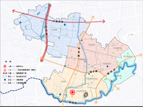 三轴四片:“三轴”——陆域疏散救援主干道(外环高速)、陆域疏散救援次干道(沪嘉高速)、水域疏散干道(苏州河);“四片”——四大防灾片区,即中部真如城市副中心拓展防灾片区、西部桃浦智创城战略储备防灾片区、南部商业商务核心承载防灾片区、东部滨水生态休闲防灾片区;