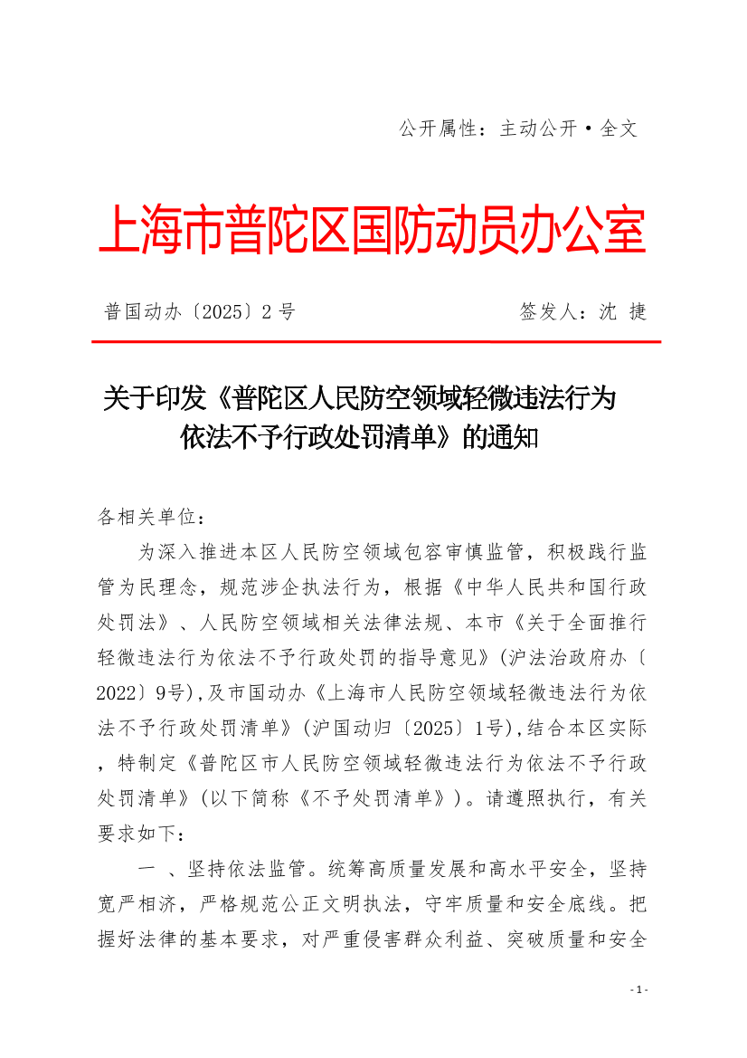 关于印发《普陀区人民防空领域轻微违法行为依法不予行政处罚清单》的通知