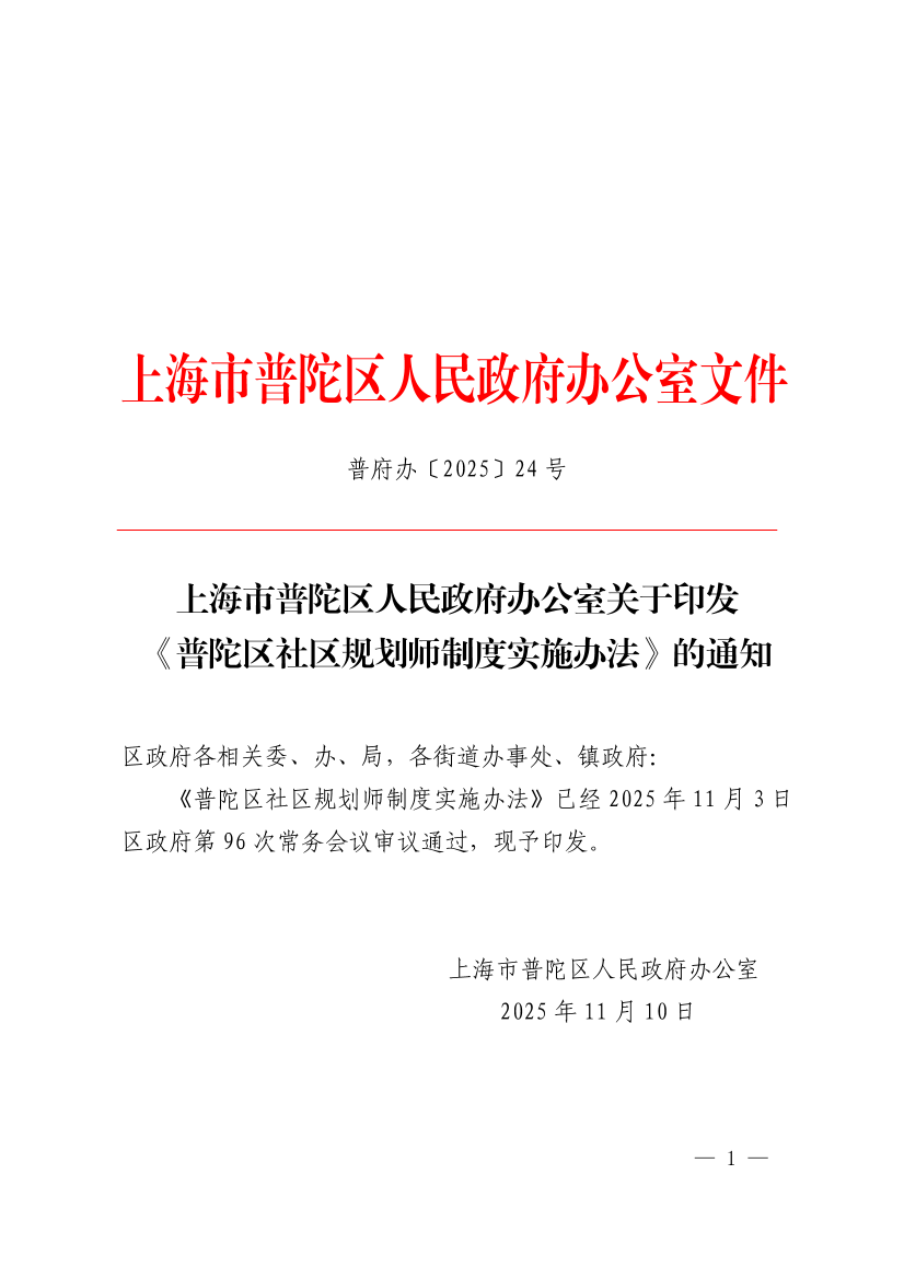 《普陀区社区规划师制度实施办法》已经2025年11月3日区政府第96次常务会议审议通过,现予印发。