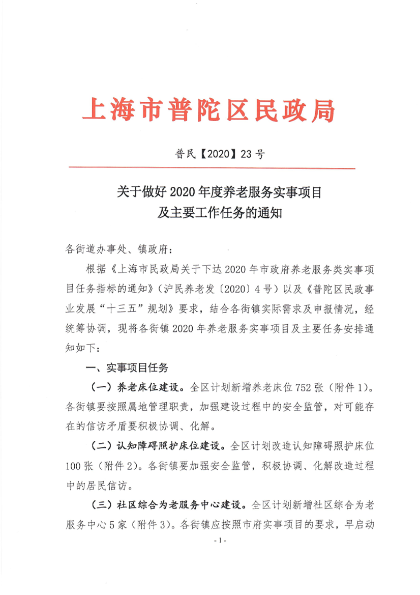根据《上海市民政局关于下达2020年市政府养老服务类实事项目任务指标的通知》(沪民养老发〔2020〕4号)以及《普陀区民政事业发展“十三五”规划》要求,结合各街镇实际需求及申报情况,经统筹协调,现将各街镇2020年养老服务实事项目及主要任务安排通知如下: