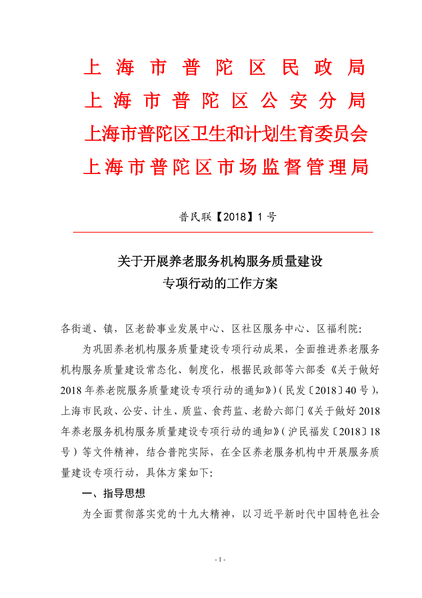 为巩固养老机构服务质量建设专项行动成果,全面推进养老服务机构服务质量建设常态化、制度化,根据民政部等六部委《关于做好2018年养老院服务质量建设专项行动的通知》)(民发〔2018〕40号),上海市民政、公安、计生、质监、食药监、老龄六部门《关于做好2018年养老服务机构服务质量建设专项行动的通知》(沪民福发〔2018〕18号)等文件精神,结合普陀实际,在全区养老服务机构中开展服务质量建设专项行动,具体方案如下: