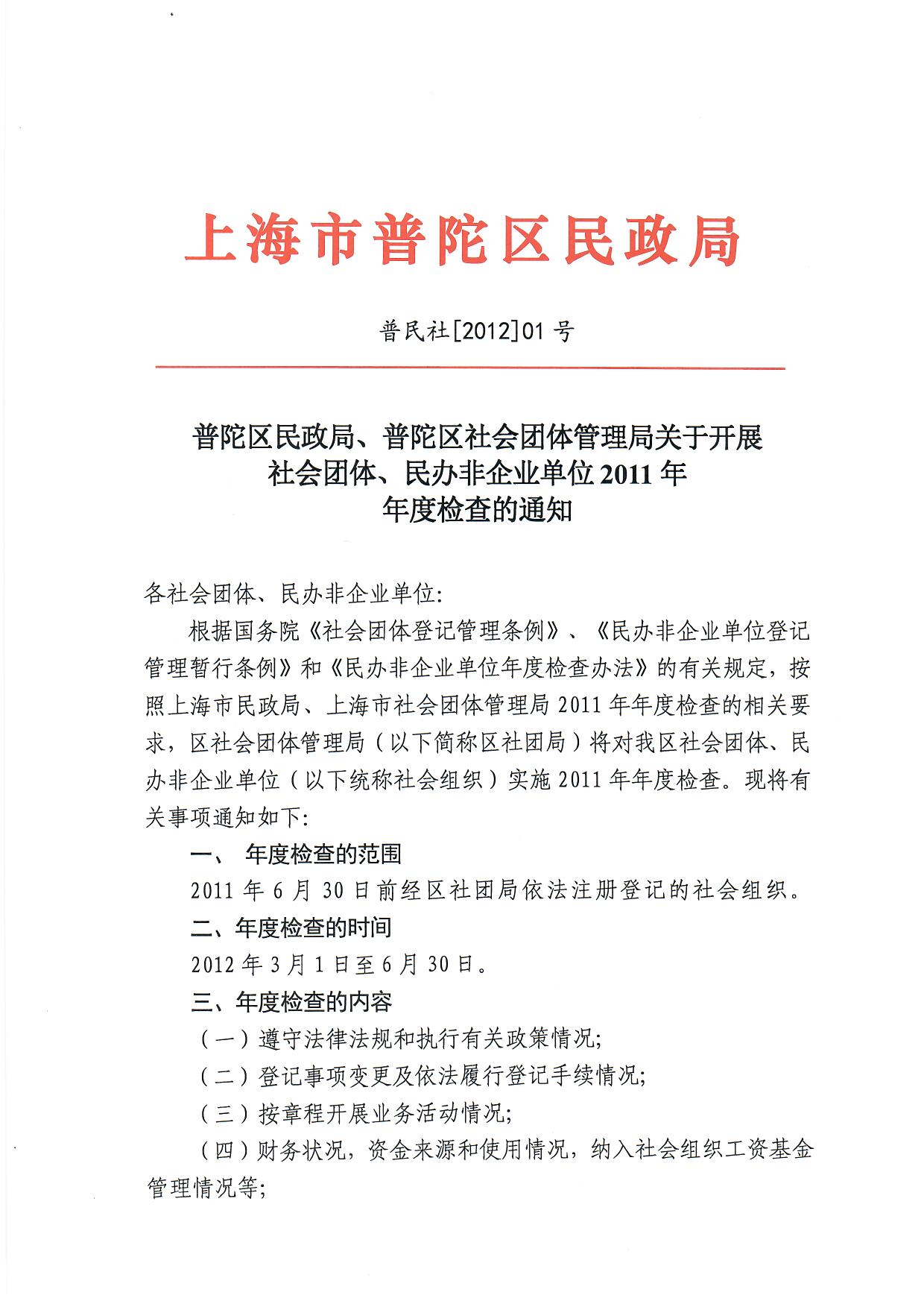 (五)2012年6月30日前,区社团局对年度检查材料进行审查,做出年度检查合格、基本合格或不合格的结论,并在“上海社会组织”网上公布。社会组织应在2012年7月31日前持《登记证书》(副本)到区社团局加盖年检印章。