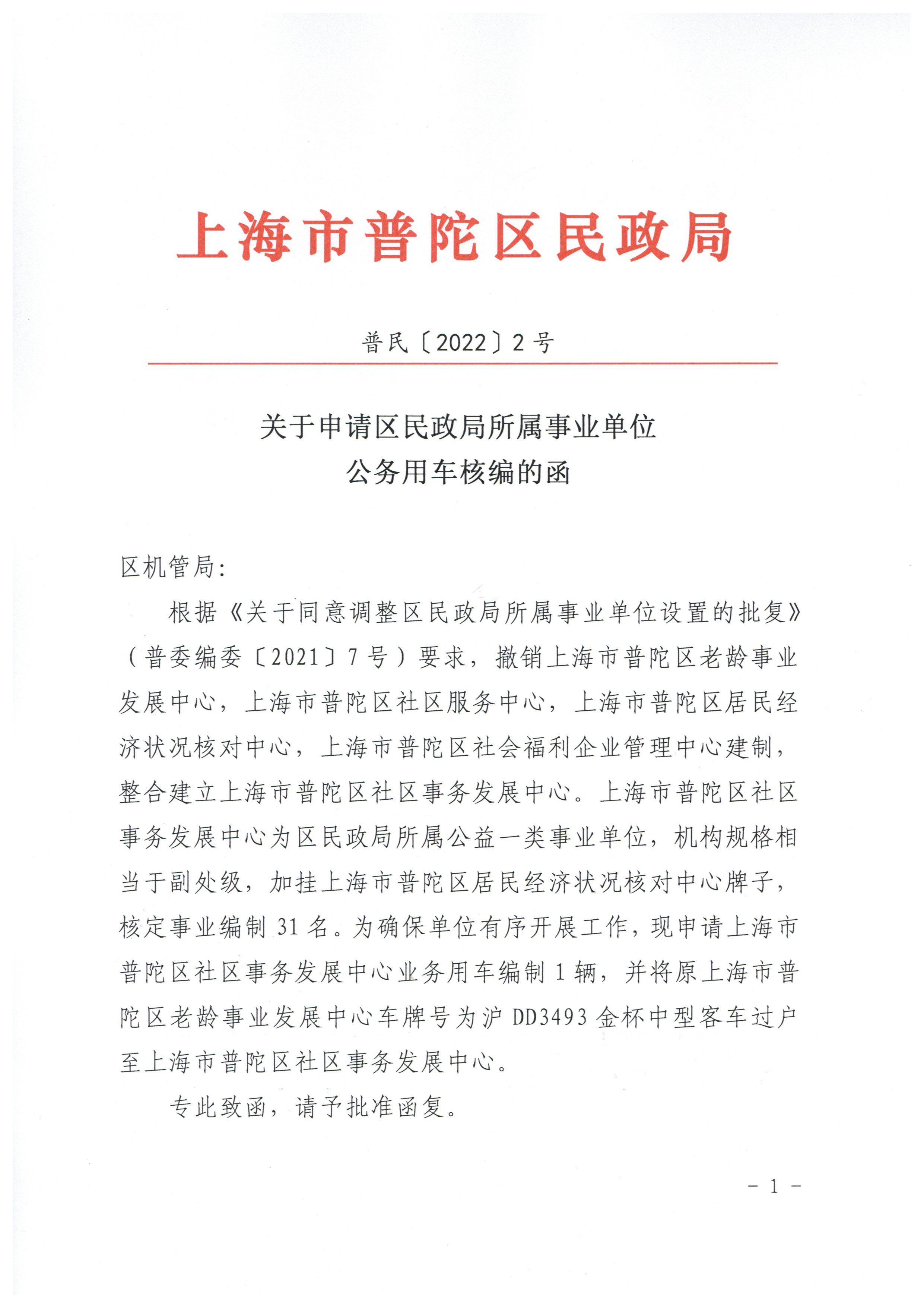 根据《关于同意调整区民政局所属事业单位设置的批复》(普委编委〔2021〕7号)要求,撤销上海市普陀区老龄事业发展中心,上海市普陀区社区服务中心,上海市普陀区居民经济状况核对中心,上海市普陀区社会福利企业管理中心建制,整合建立上海市普陀区社区事务发展中心。上海市普陀区社区事务发展中心为区民政局所属公益一类事业单位,机构规格相当于副处级,加挂上海市普陀区居民经济状况核对中心牌子,核定事业编制31名。为确保单位有序开展工作,现申请上海市普陀区社区事务发展中心业务用车编制1辆,并将原上海市普陀区老龄事业发展中心车牌号为沪DD3493金杯中型客车过户至上海市普陀区社区事务发展中心。