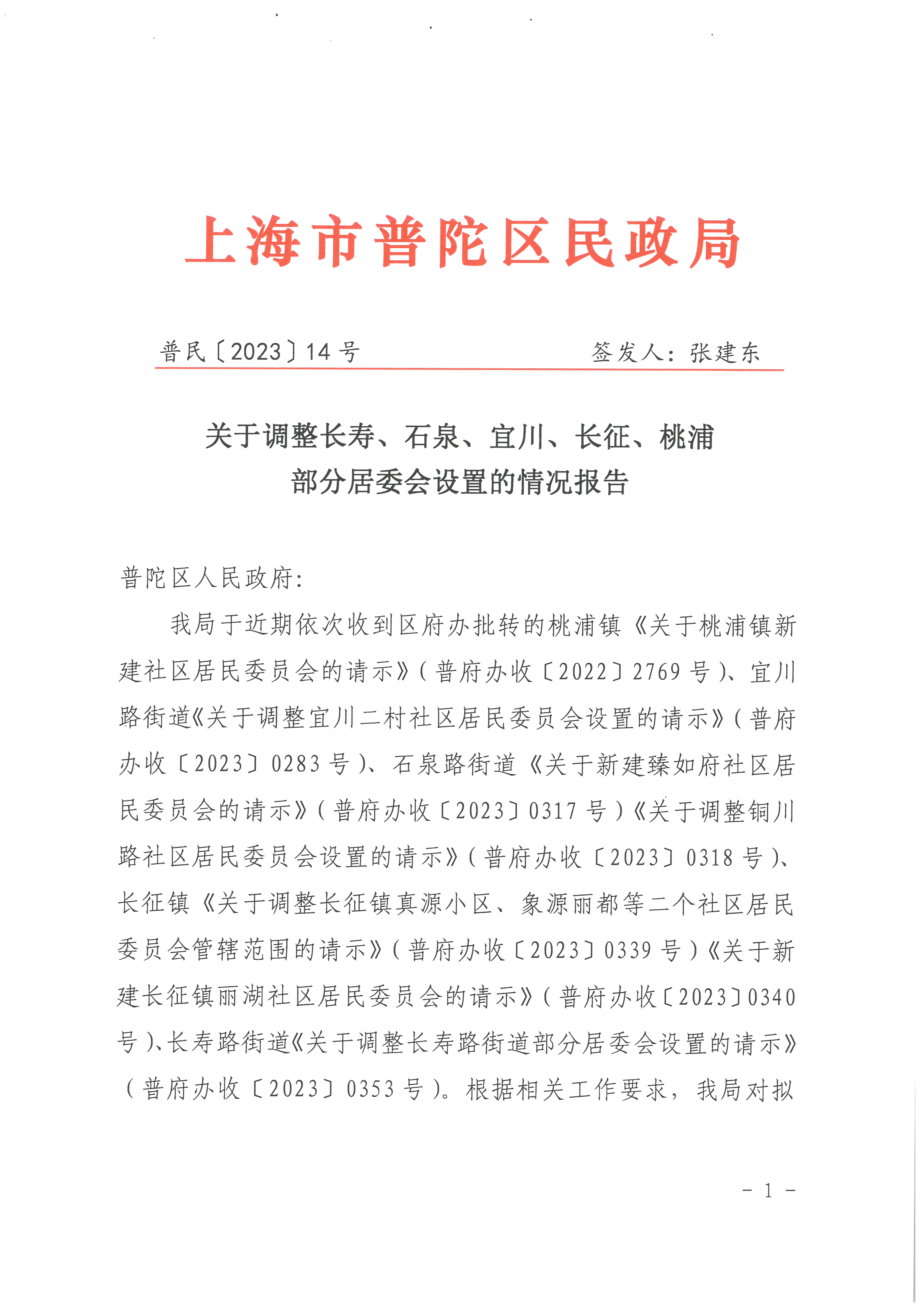 我局于近期依次收到区府办批转的桃浦镇《关于桃浦镇新建社区居民委员会的请示》(普府办收〔2022〕2769号)、宜川路街道《关于调整宜川二村社区居民委员会设置的请示》(普府办收〔2023〕0283号)、石泉路街道《关于新建臻如府社区居民委员会的请示》(普府办收〔2023〕0317号)《关于调整铜川路社区居民委员会设置的请示》(普府办收〔2023〕0318号)、长征镇《关于调整长征镇真源小区、象源丽都等二个社区居民委员会管辖范围的请示》(普府办收〔2023〕0339号)《关于新建长征镇丽湖社区居民委员会的请示》(普府办收〔2023〕0340号)、长寿路街道《关于调整长寿路街道部分居委会设置的请示》(普府办收〔2023〕0353号)。根据相关工作要求,我局对拟调整设置的居委会开展了实地调研,具体情况如下: